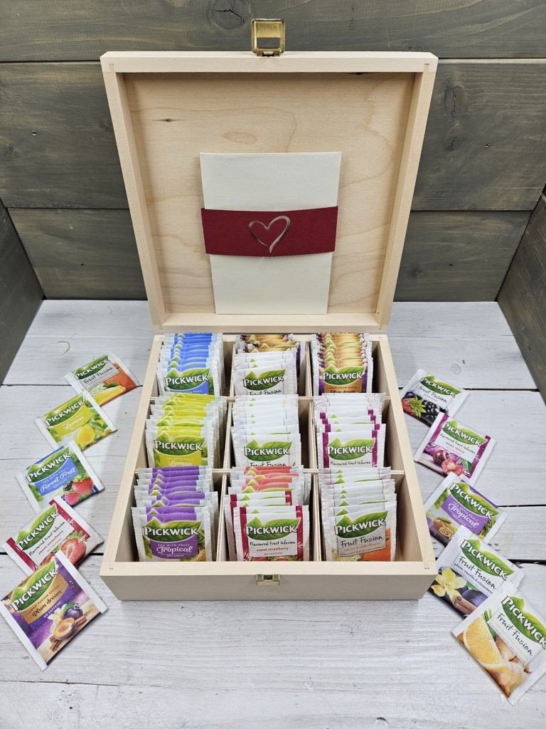 Az ár tartalmazza az ajándékdobozt és az általad kiválasztott édességet vagy kávét vagy teát, + 9 fakkos kivehető fa tea filter tartó betétet, illetve 1 darab üres borítékot. ( A borítékba személyre szóló jókívánság kártyát, üzenetet tudsz tenni.)