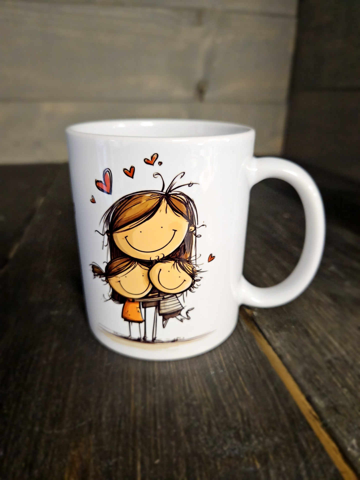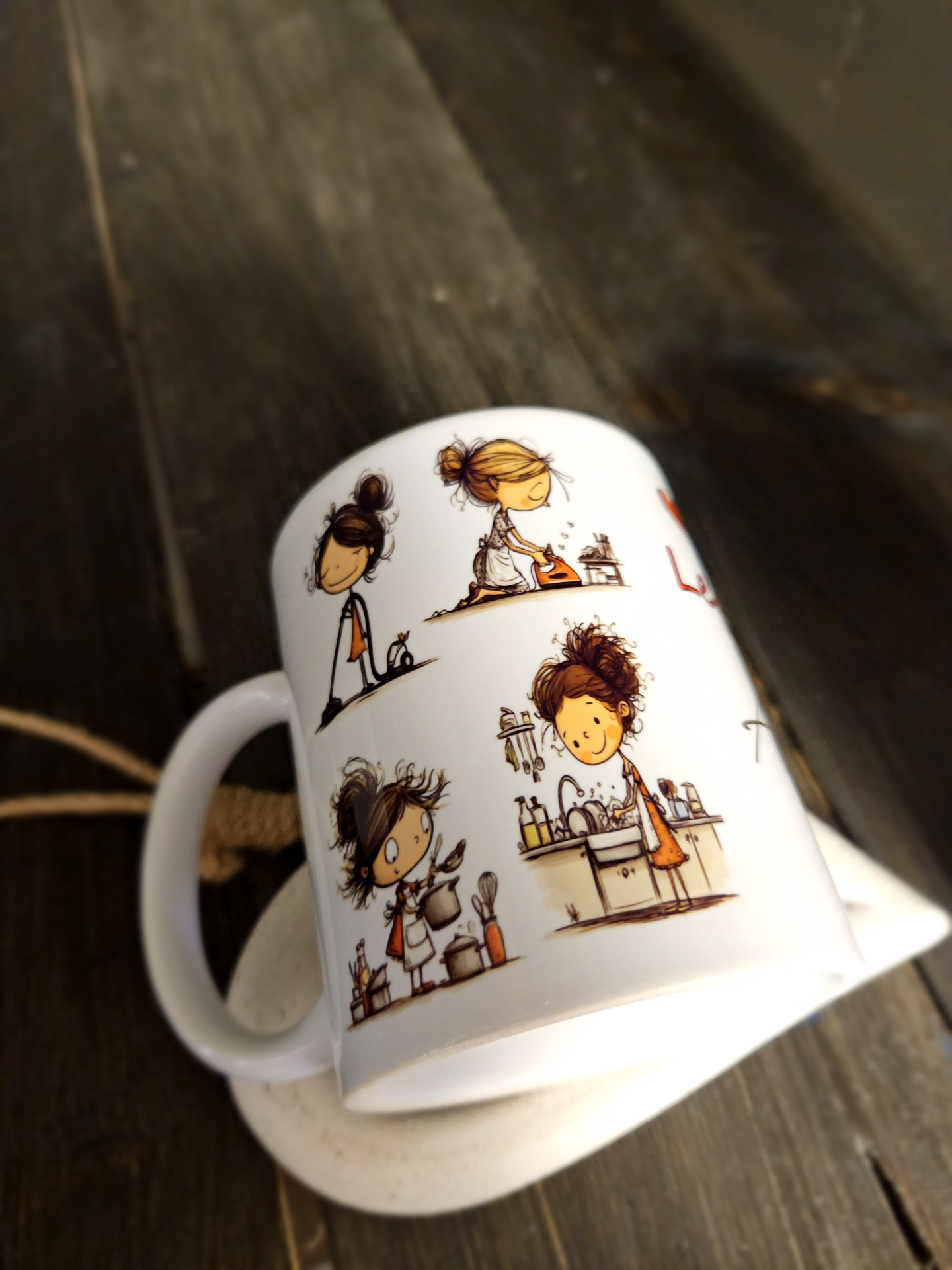 Anya a gyermekeivel és házimunkát végző Anya mintával és Legjobb Anya szöveggel nyomott bögre.