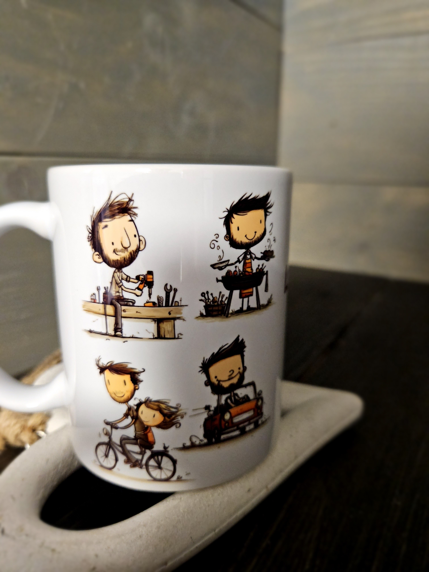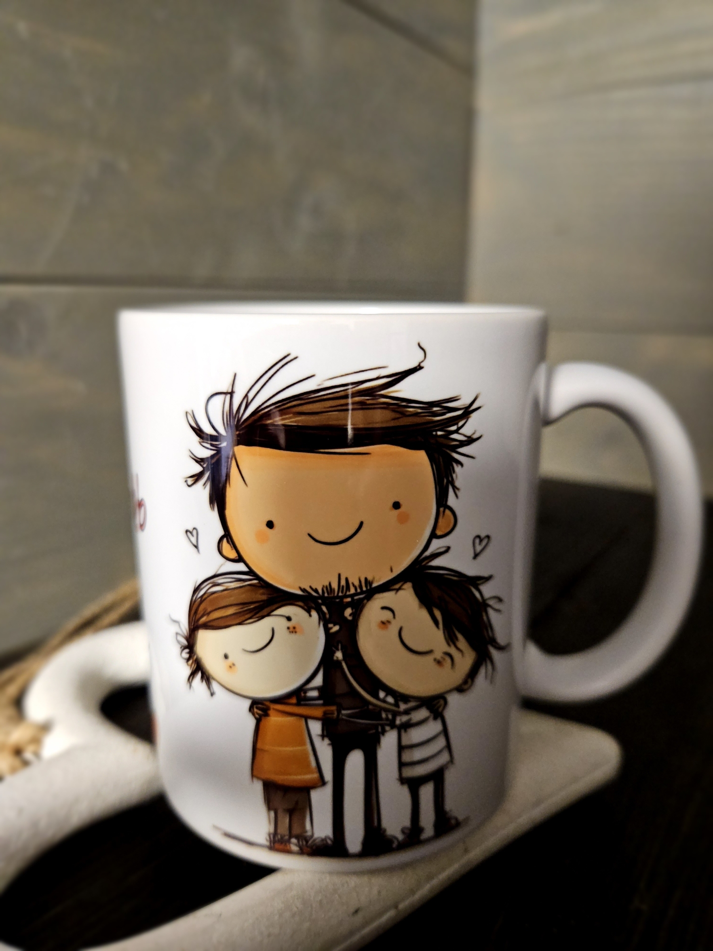 Apa a gyermekeivel és munkát végző Apa mintával és Legjobb Apa szöveggel nyomott bögre.