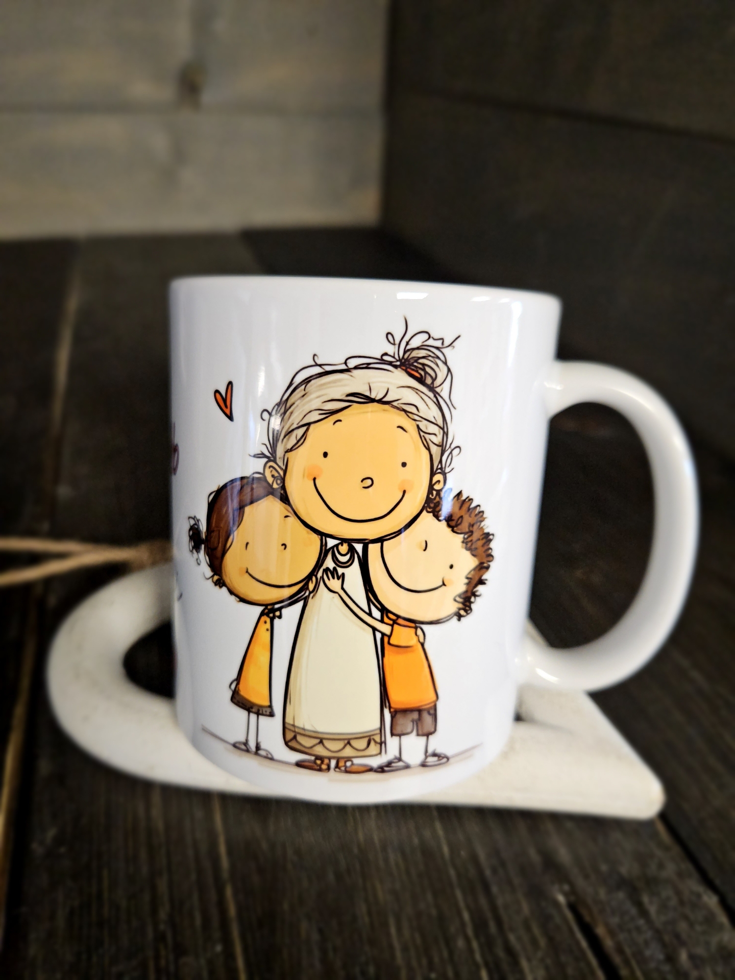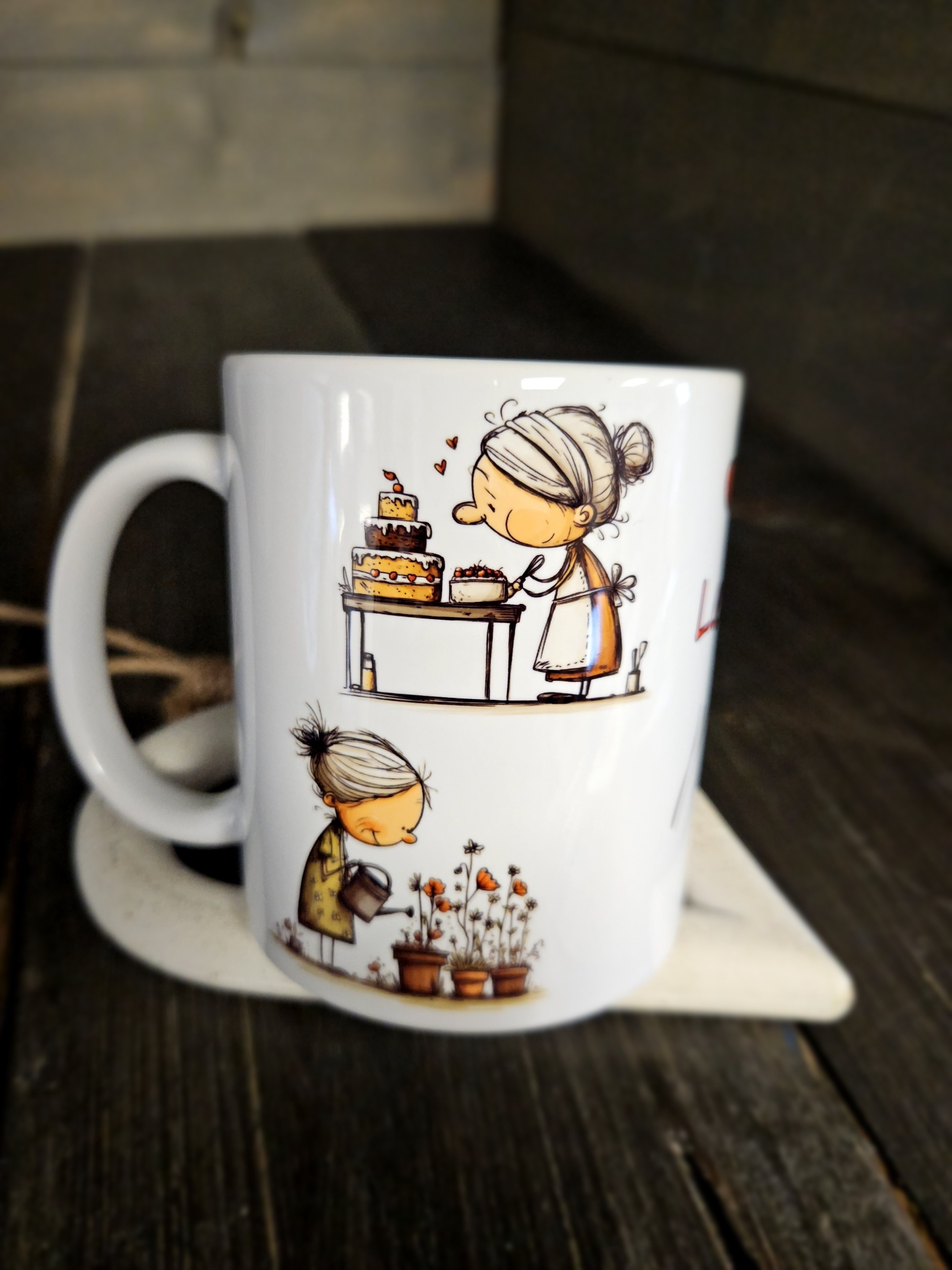 Nagyi az unokáival és házimunkát végző Nagyi mintával és Legjobb Nagyi szöveggel nyomott bögre.