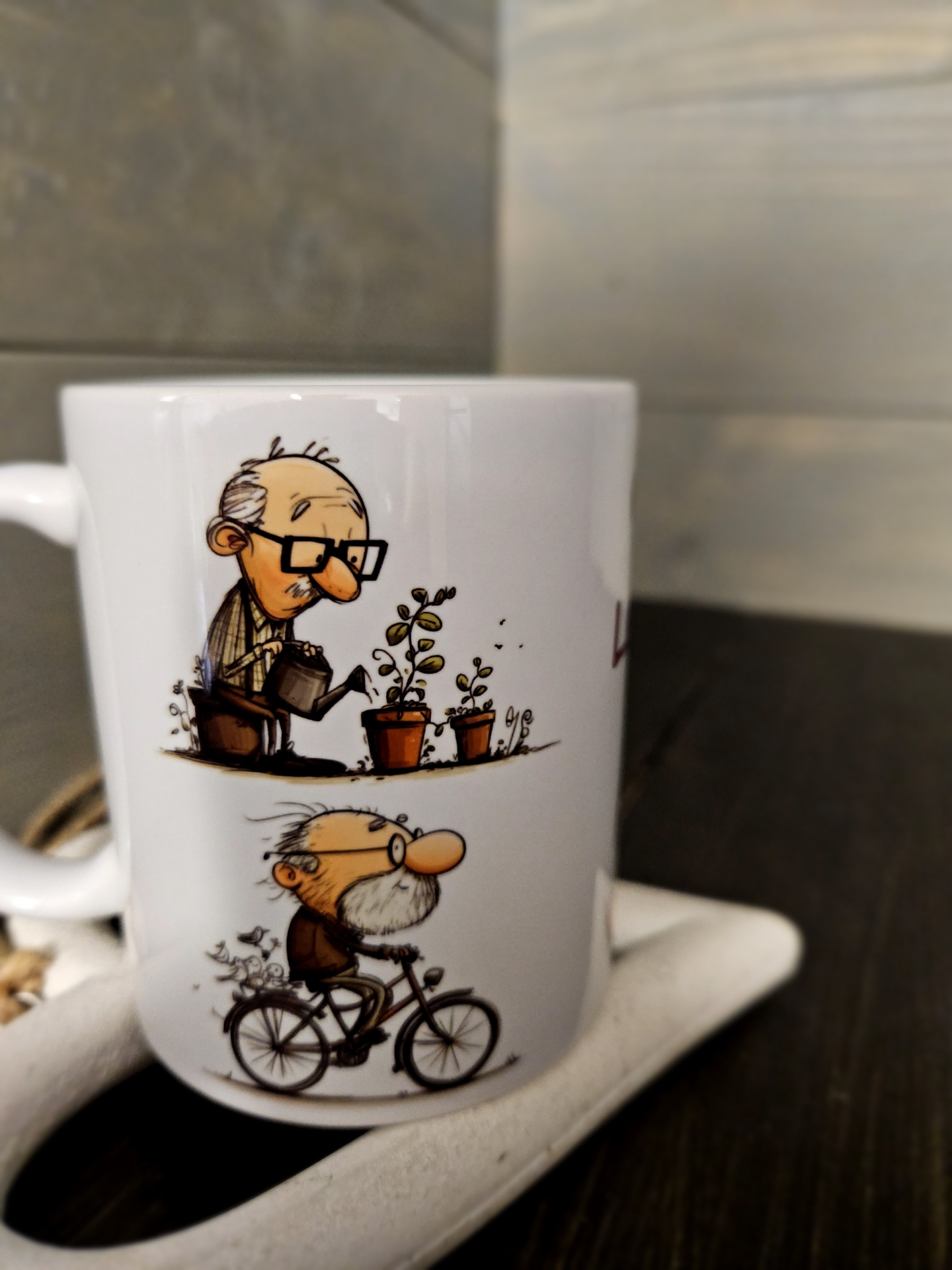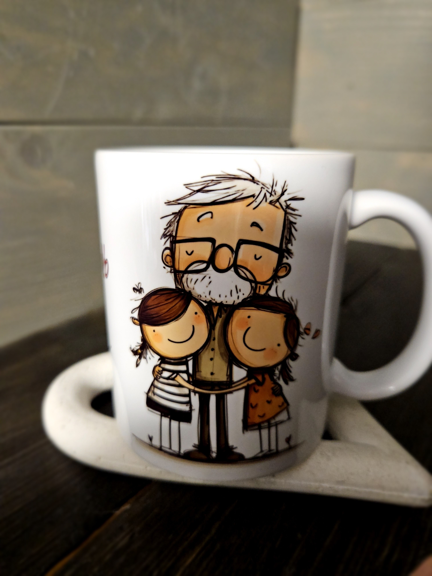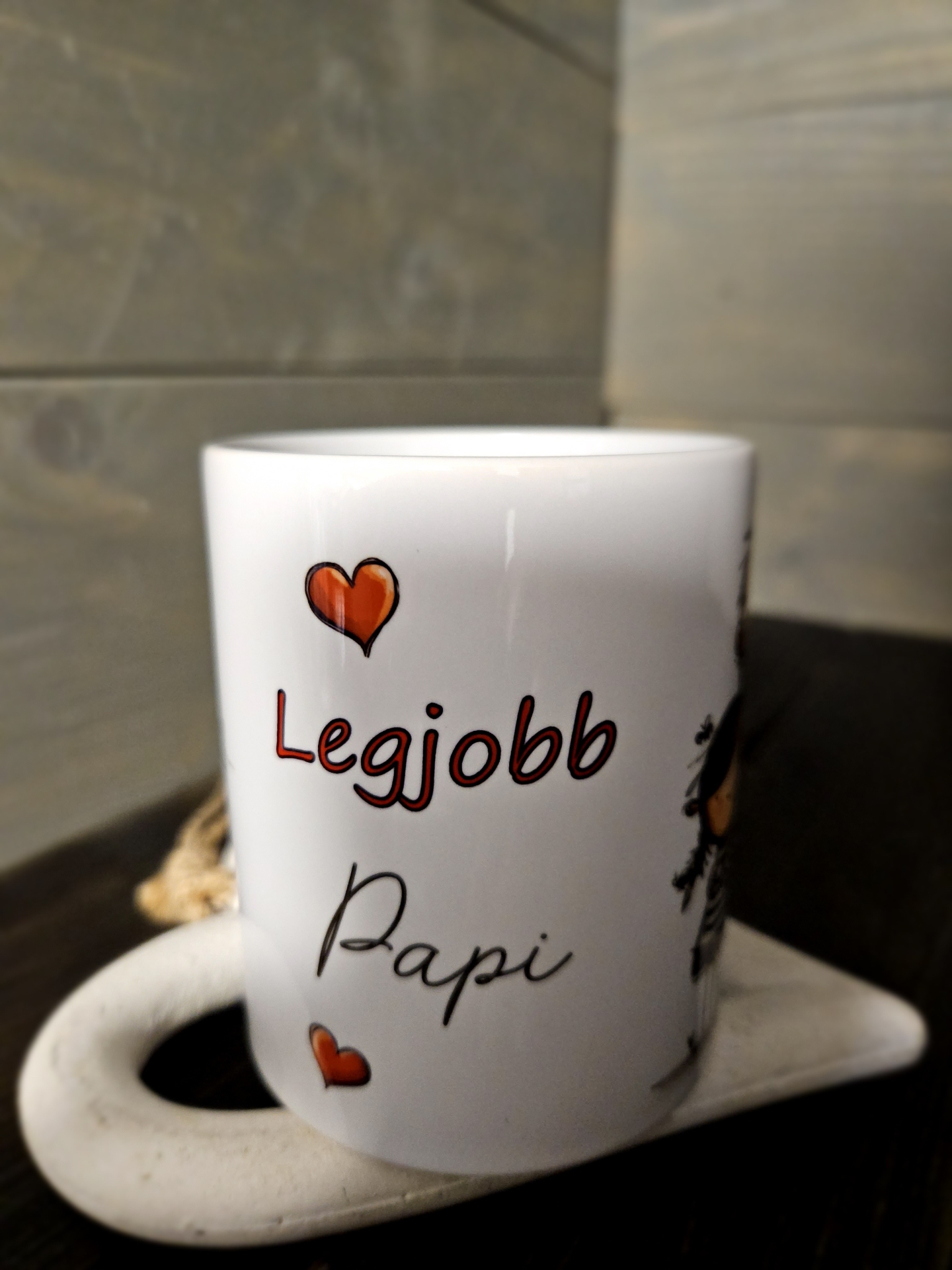 Papa az unokáival és munkát végző Papa mintával és Legjobb Papi szöveggel nyomott bögre.