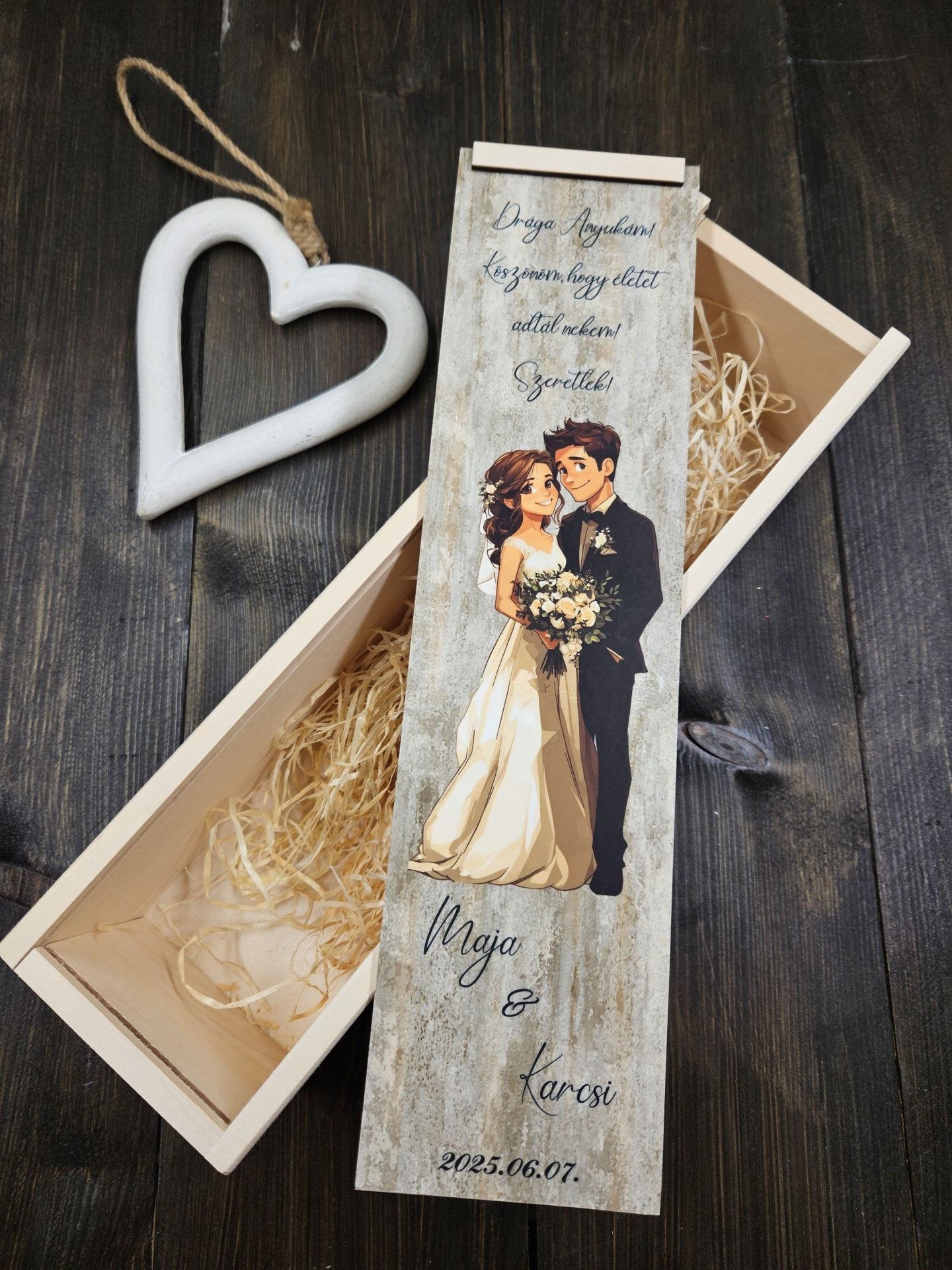 Esküvői köszönőajándék, szülőköszöntő ajándék boros doboz rajzfilm stílusú ifjú pár mintával nyomtatva.