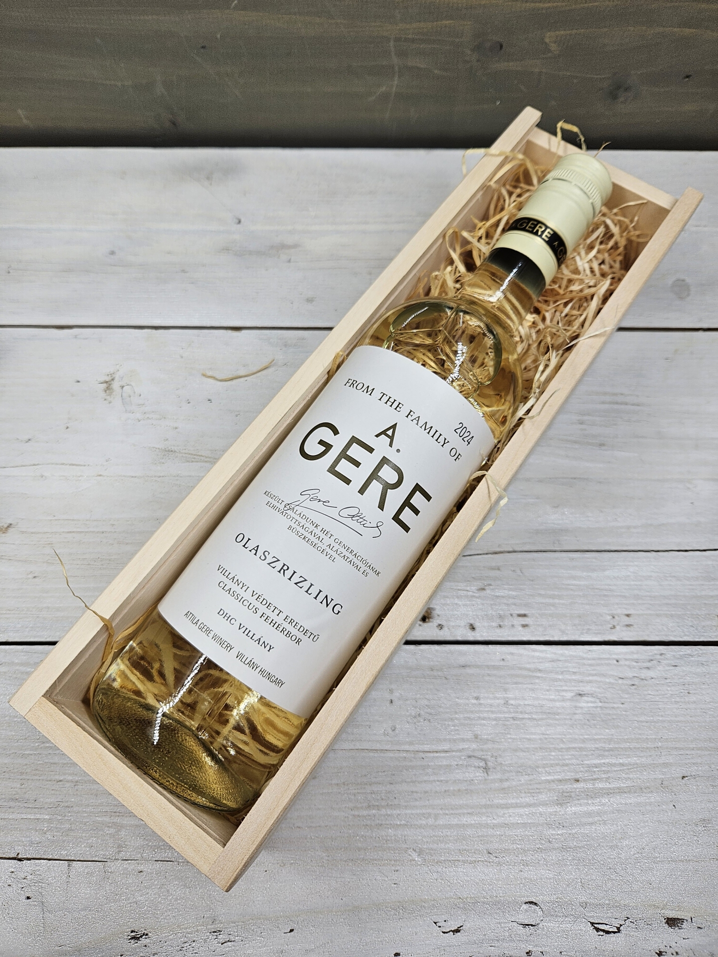 A dobozba 750 ml-s boros üveg fér, a boros doboz rendelhető üresen vagy rendelhető 3 féle mínőségi GERE Villányi borral. ( Vörösbor, Fehérbor, Rosé bor)