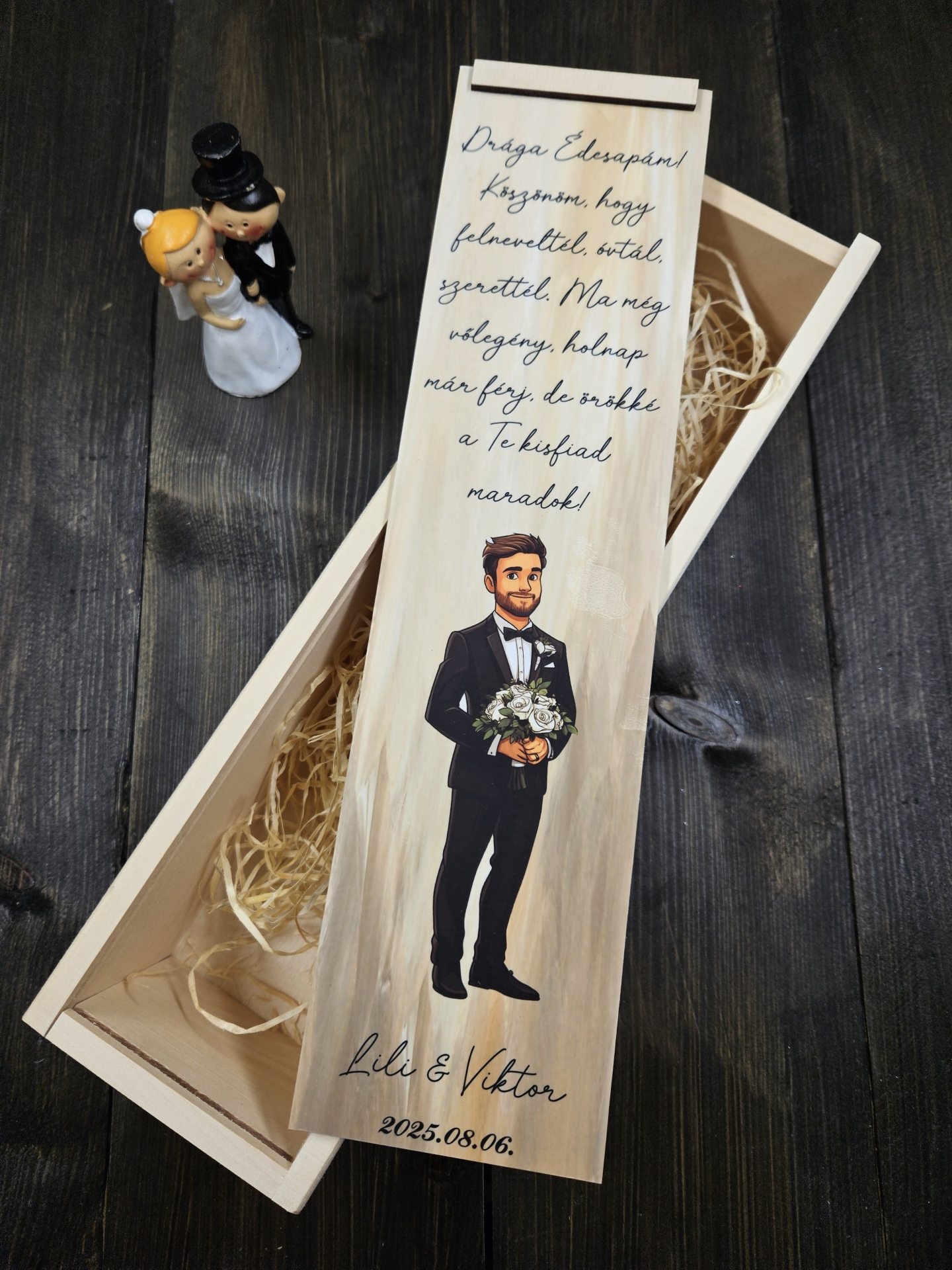 Esküvői köszönőajándék, szülőköszöntő ajándék boros doboz rajzfilm stílusú vőlegény mintával nyomtatva.