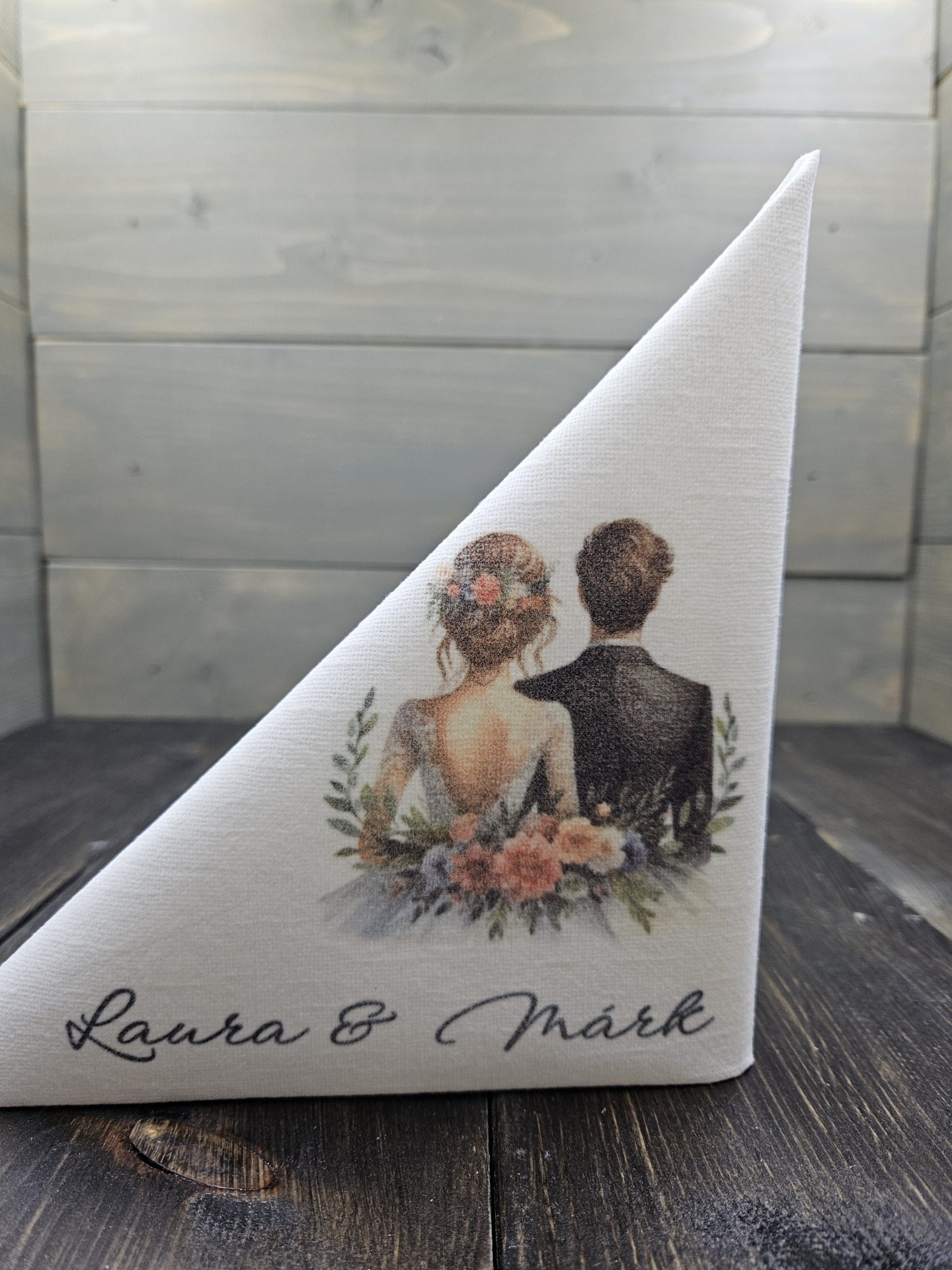 Egyedi tervezésű csodás esküvői textilhatású szalvéta, melynek mindkét oldalára van minta nyomtatva.