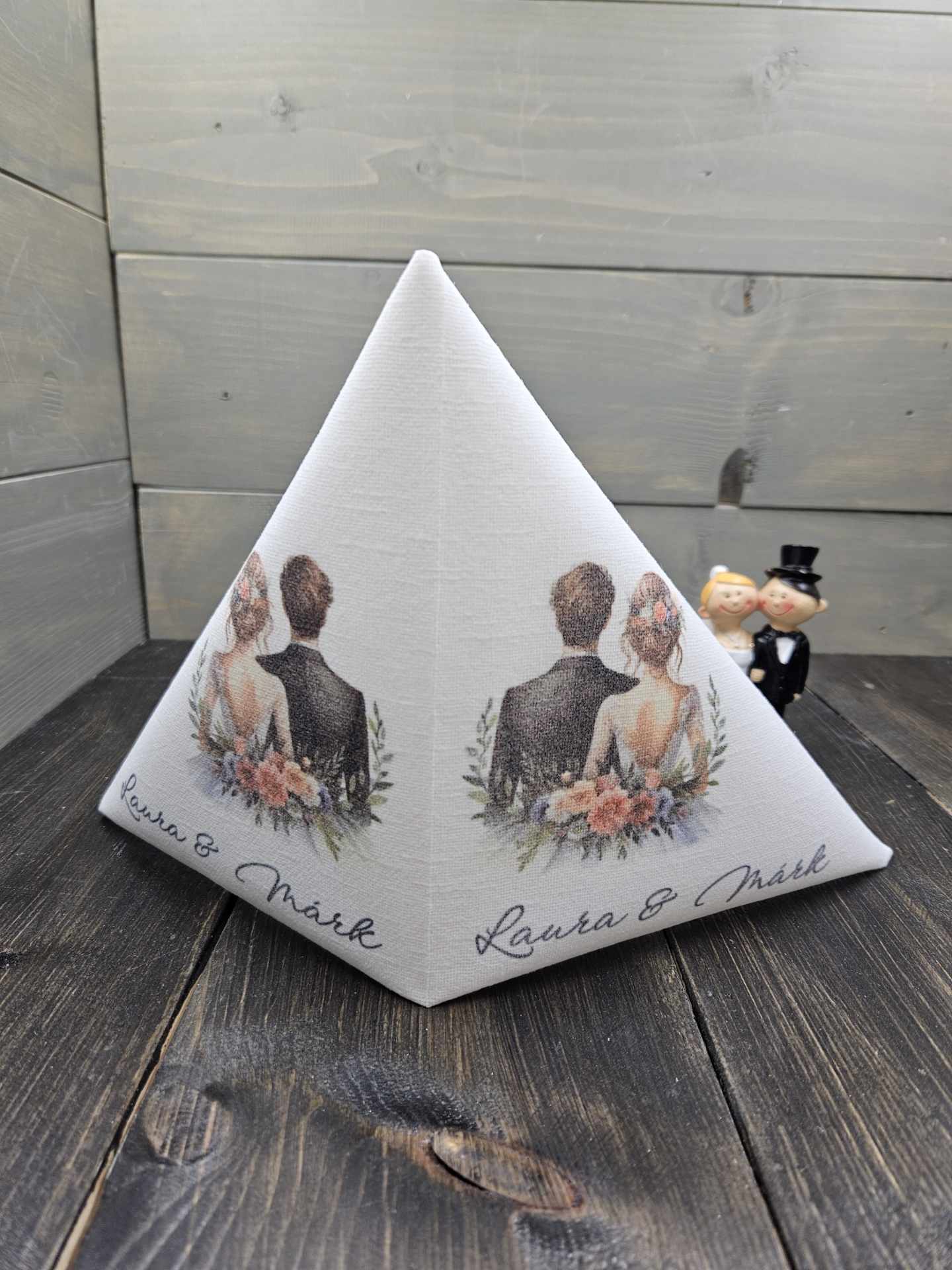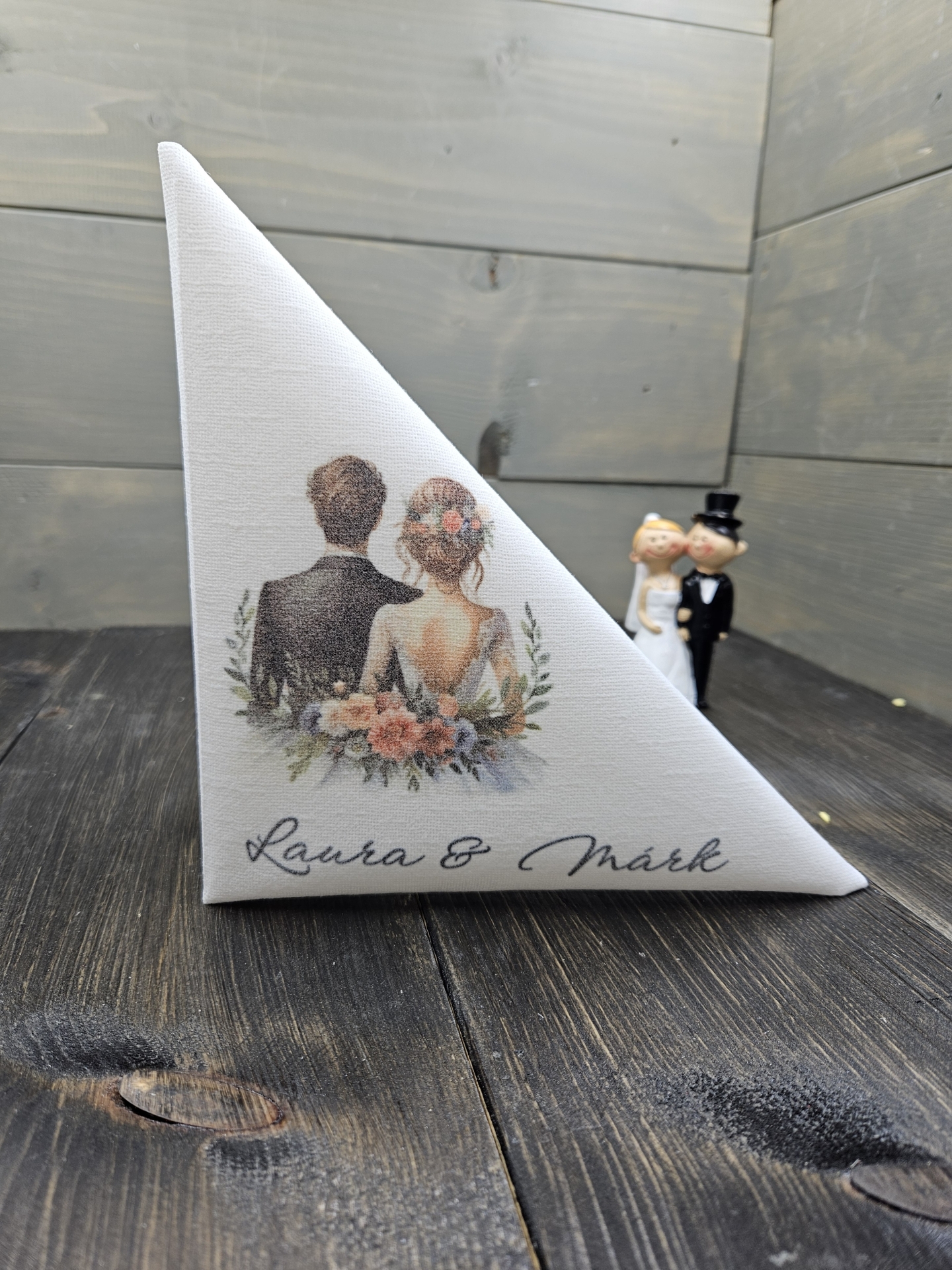 Ifjú pár motívummal és az ifjú pár nevével nyomtatva.