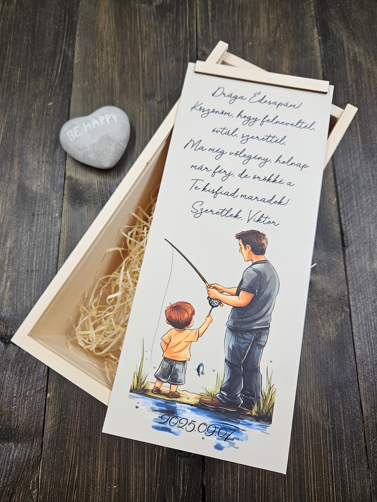 Esküvői köszönőajándék, Örömapa köszöntő ajándék italos doboz horgászó apa-fia, apa-lánya mintával nyomtatva.