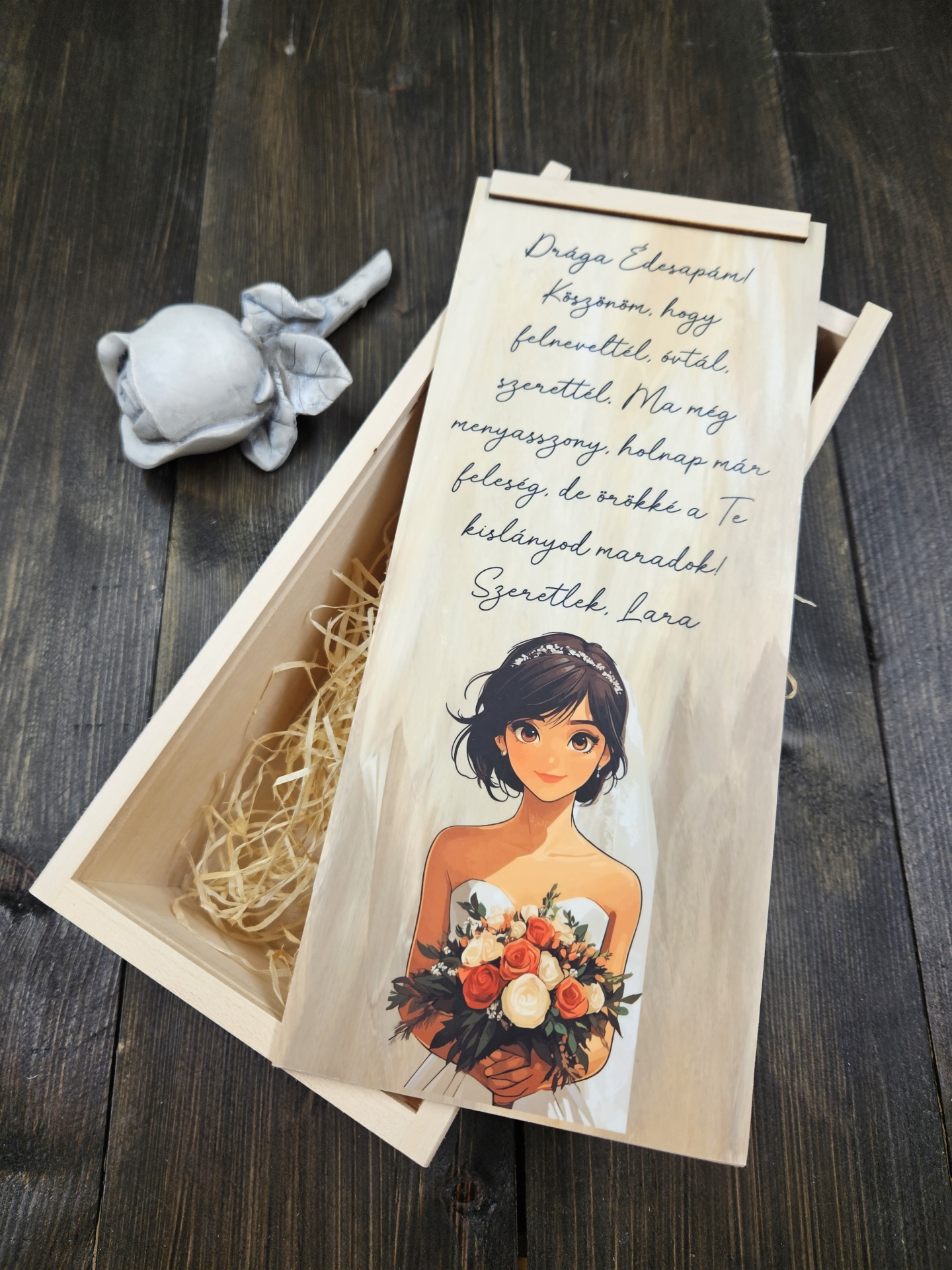 Esküvői köszönőajándék, Örömszülő köszöntő ajándék italos doboz menyasszony mintával nyomtatva.