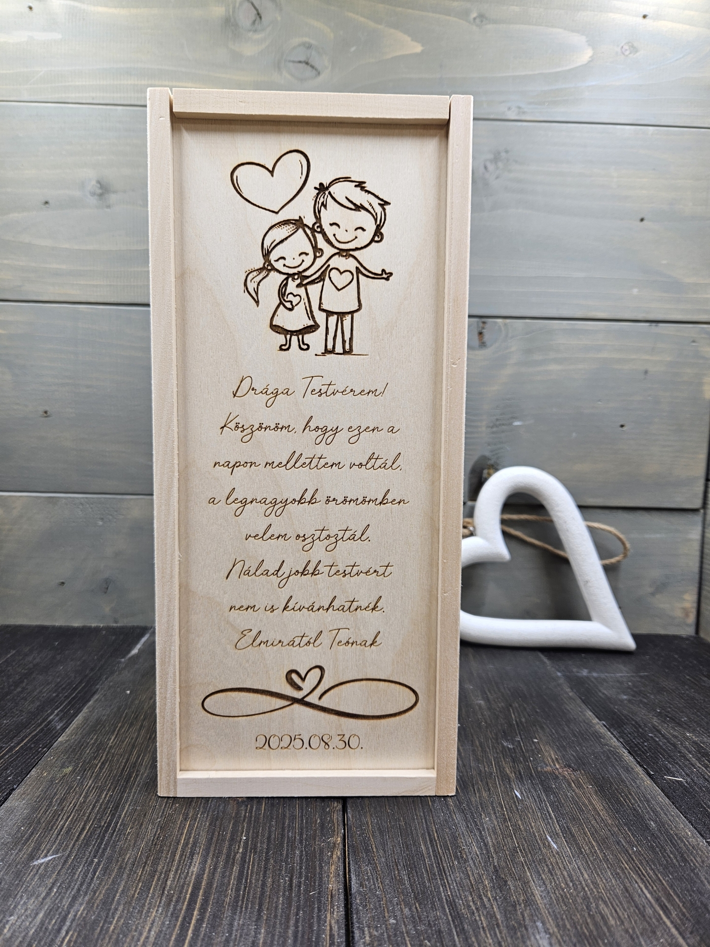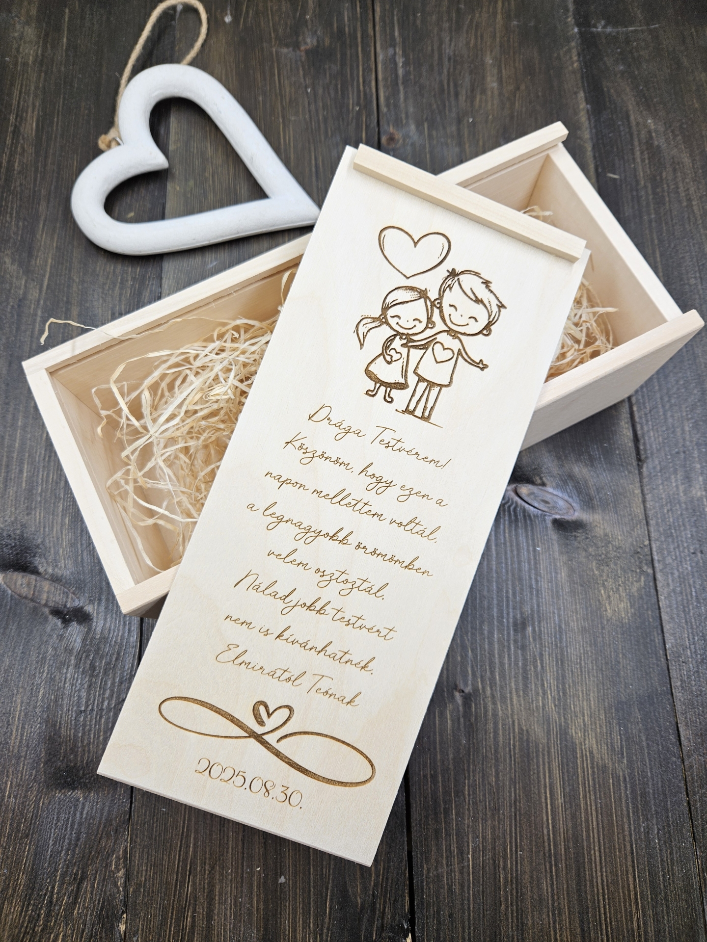 Egyedi tervezésű, testvérek mintával gravírozott, mínőségi hársfa italos ajándék testvér köszöntő díszdoboz, esküvőre köszönetajándékként testvérnek.