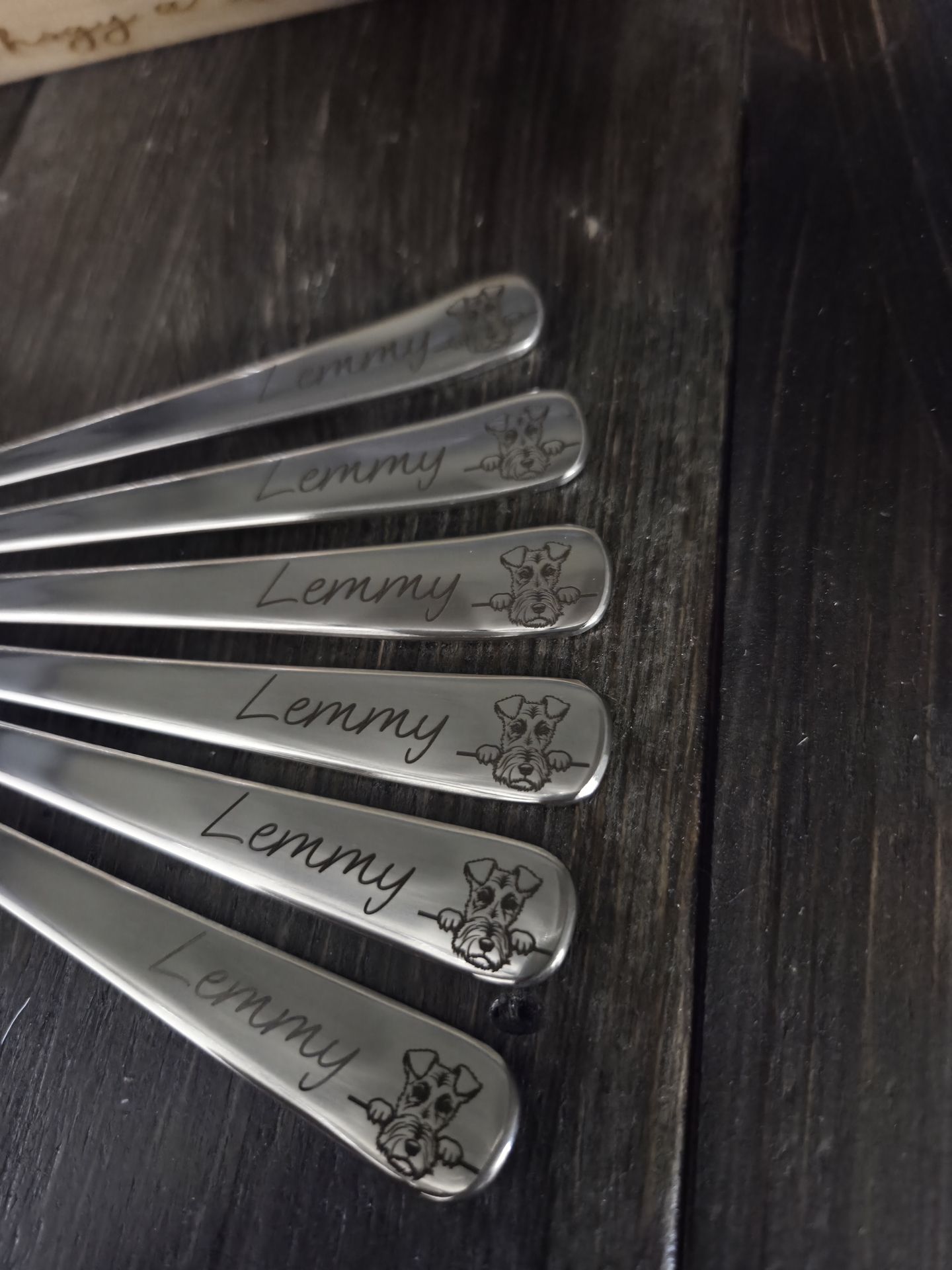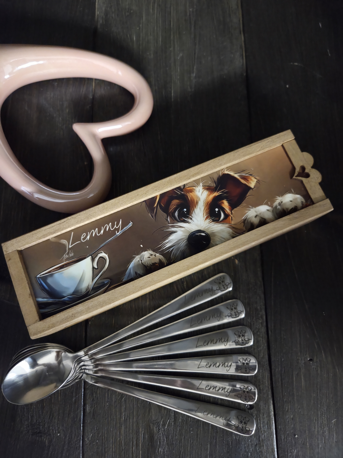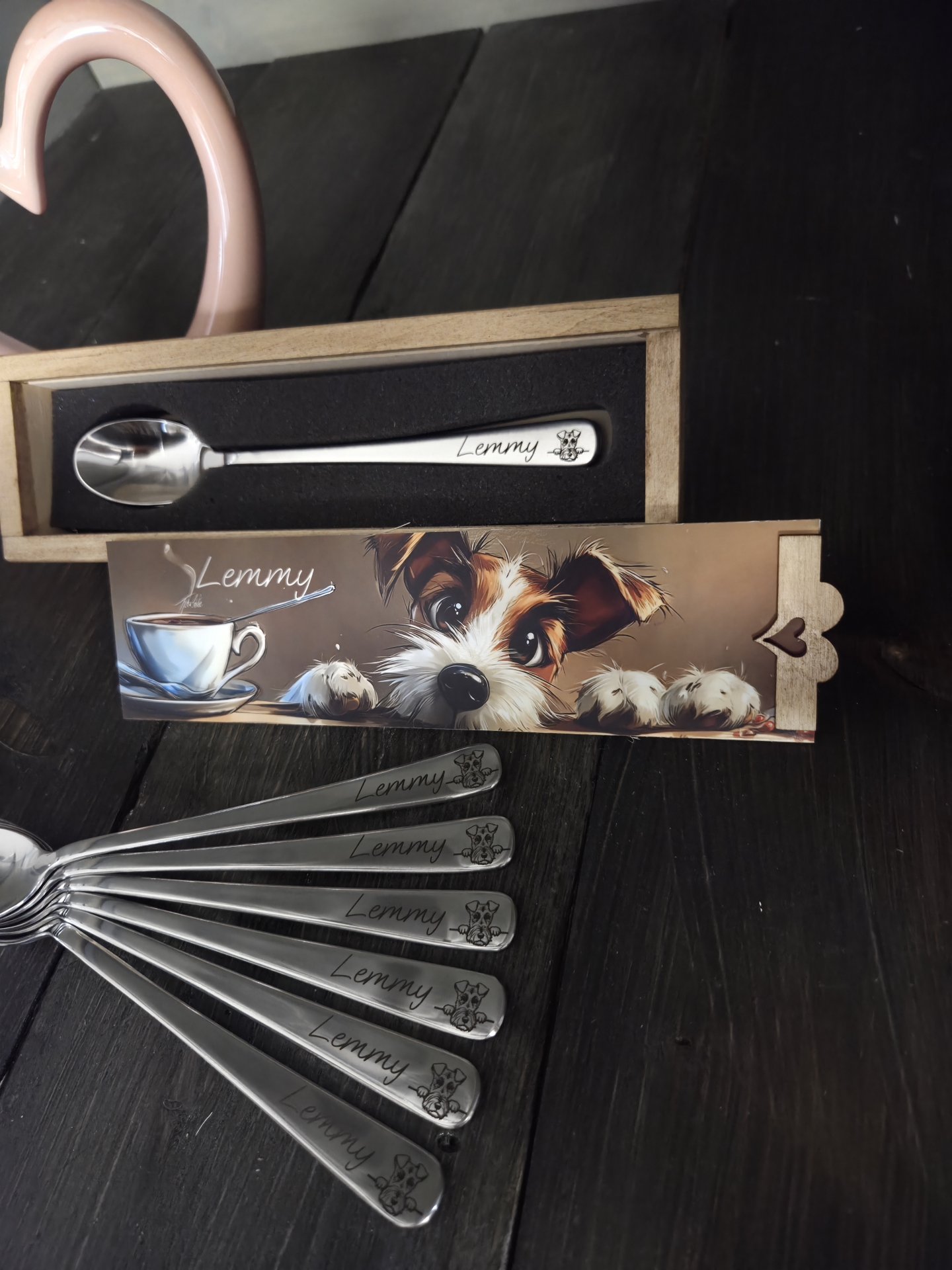 Az ajándékdobozban 6 darab ( alkalmas teás/kávés/desszertes kanálnak) Foxterrier kutyus sziluettel gravírozott kiskanál van, ezekre a kanalakra is kérhető a mintán kívül a kutyus nevének gravírozása.