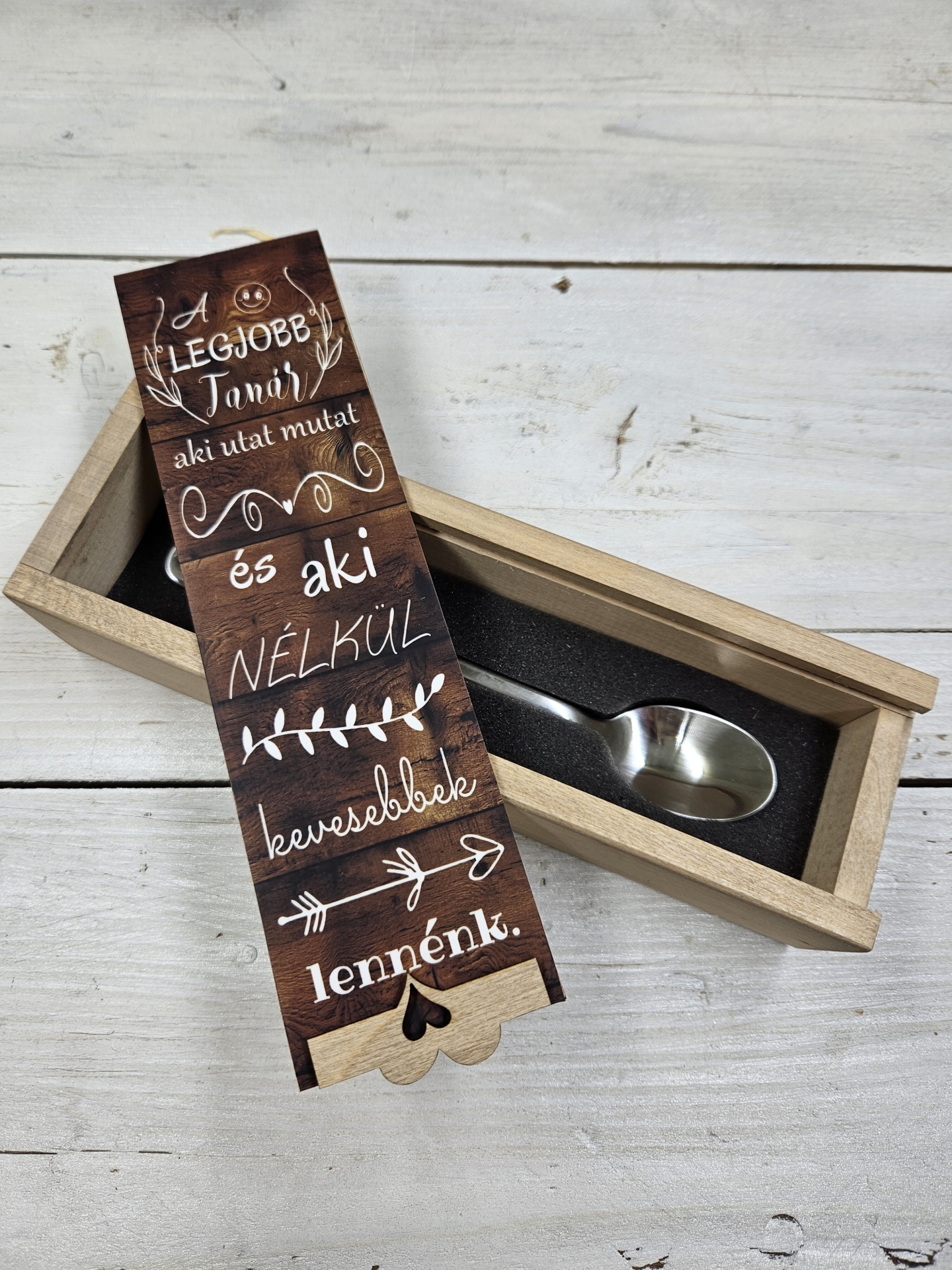 Színes mintával, egyedi szöveggel nyomtatott díszdobozban, 6 darab gravírozott kiskanalat találsz, (alkalmas teás/kávés/desszertes kanálnak) különböző gravírozott üzenetekkel, amiket teljesen személyre szabhatsz és megadhatsz a egyedi felirat keretben.