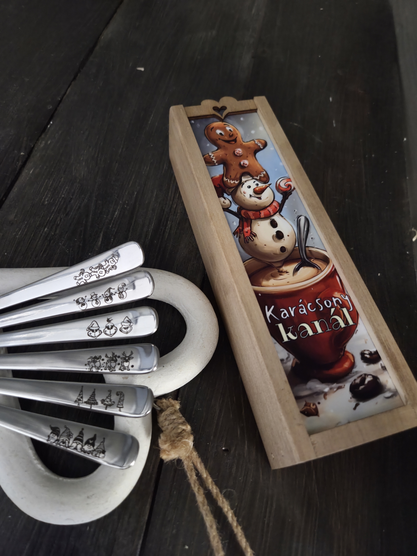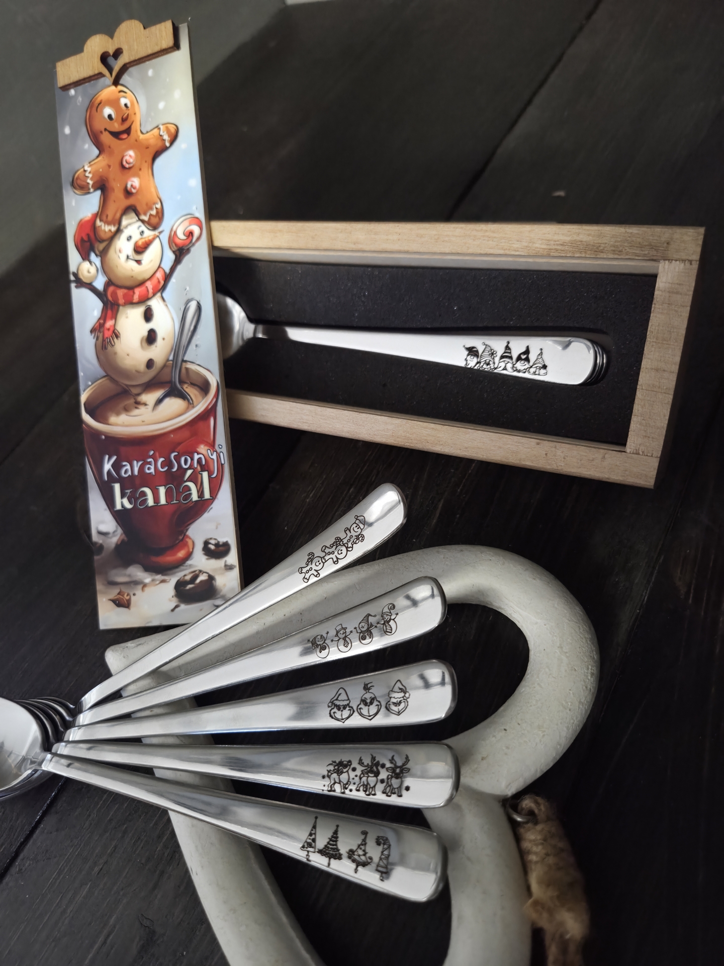 Az ajándékdobozban 6 darab ( alkalmas teás/kávés/desszertes kanálnak) karácsonyi figura sziluettel gravírozott kiskanál van.