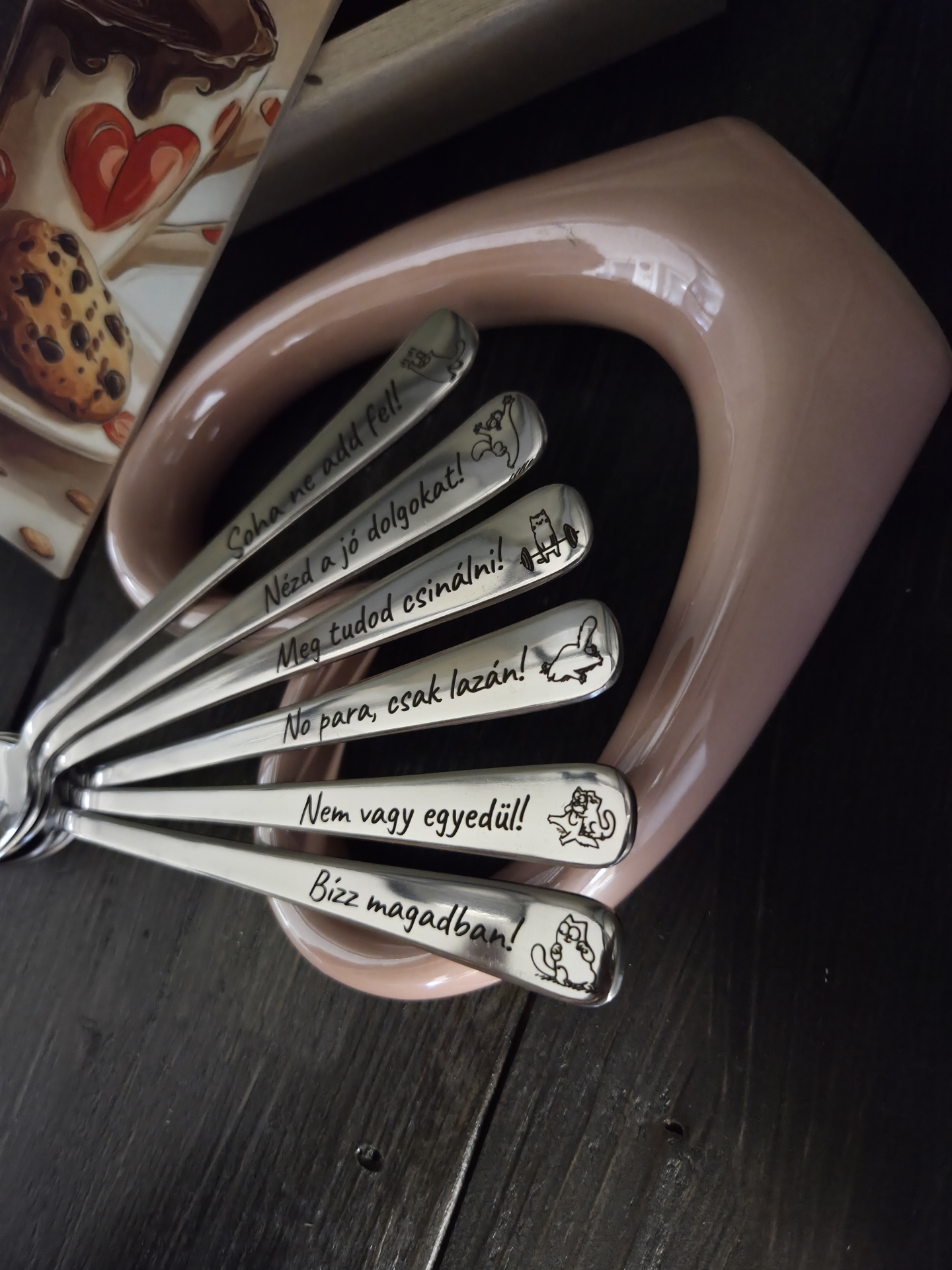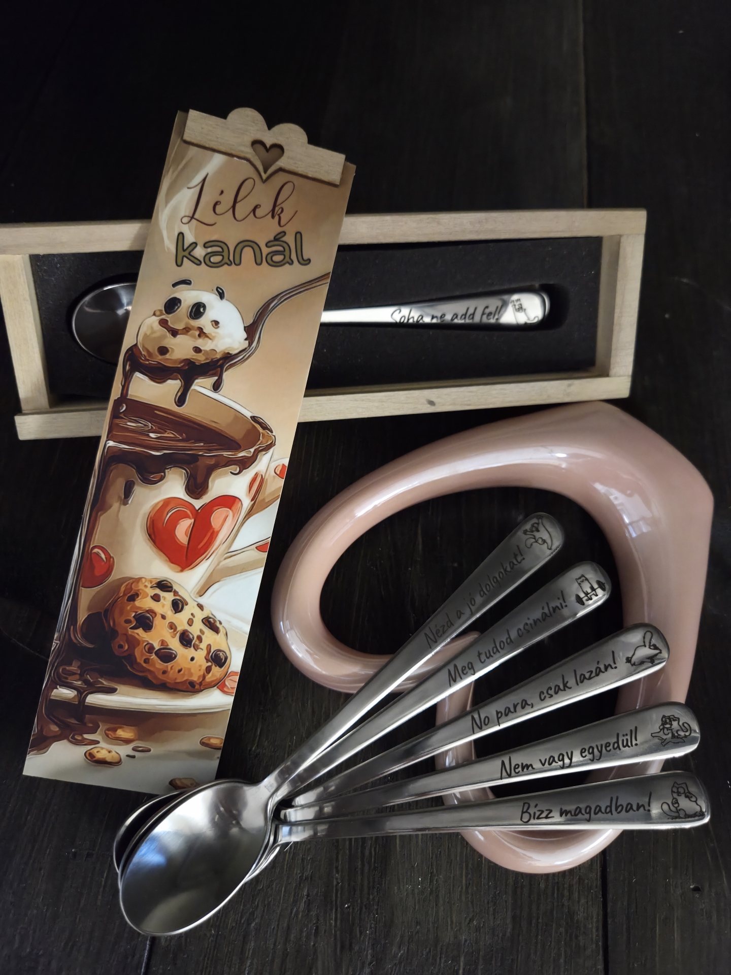 Motivációs, lelket erősítő üzenetekkel gravírozott kiskanalak díszdobozban kamaszoknak, iskolásoknak, szorongásra hajlamos családtagoknak, hogy már a reggeli tea, kávé, kakaó fogyasztása megnyugtató legyen.