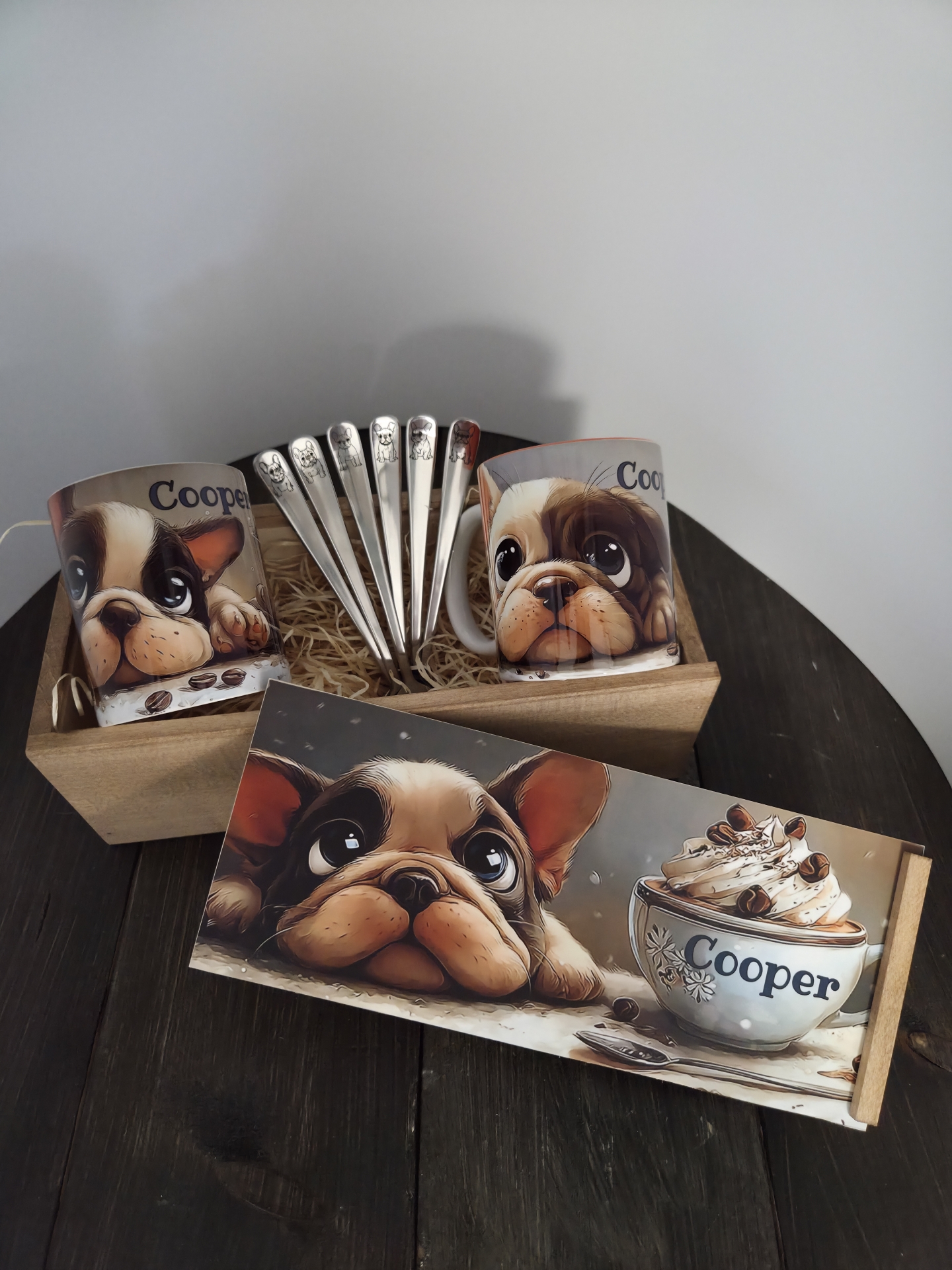 A dobozban 2 darab egyedi cuki Bulldog és kávéscsésze mintával és névvel nyomtatott 330 ml-s bögréket találsz, illetve a bögrékhez egy 6 darabos különböző bulldog mintával gravírozott kis kanál készletet, amire rá tudom gravírozni a kutyusod nevét is.