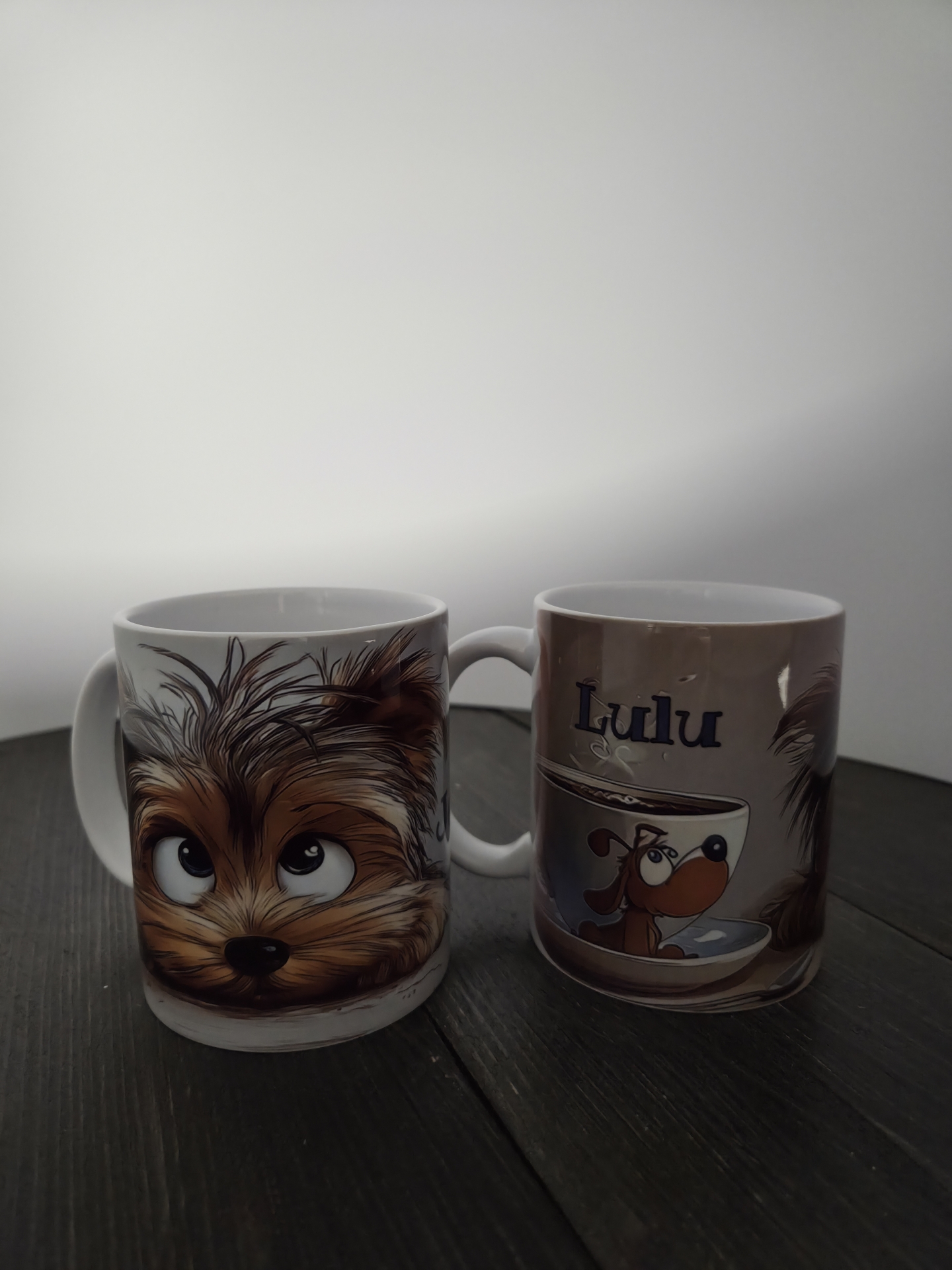 A dobozban 2 darab egyedi cuki Yorki és kávéscsésze mintával és névvel nyomtatott 330 ml-s bögréket találsz, illetve a bögrékhez egy 6 darabos különböző Yorki mintával gravírozott kis kanál készletet, amire rá tudom gravírozni a kutyusod nevét is.